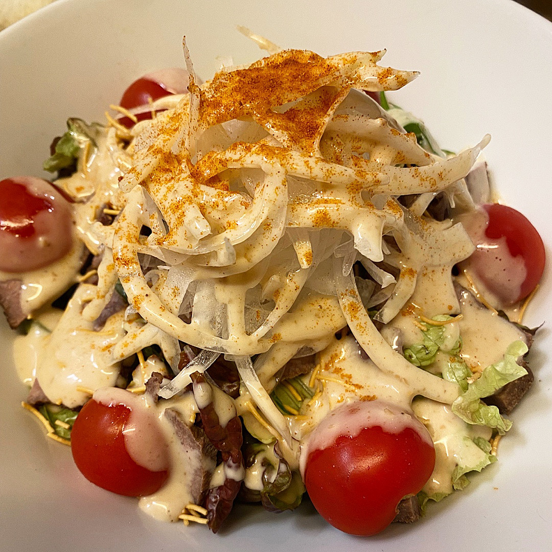 スモーク牛タンとパリパリ麺を乗せたオリジナルサラダ